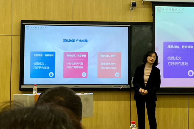 讲座中,徐莉教授围绕国家需求、教学反思、优化基本功、改革创新等四个方面,分析了国家对外语人才的需求以及应该培养什么样的外语人才,并与老师们共同探讨了外语教学中面临的问题及解决方法。徐莉教授以其主讲的《实践俄语》为例,分享了如何进行教学反思,如何编写课程大纲、教案及教学设计,以及课堂怎样采取多种方式提升员工的外语综合能力等。徐莉教授鼓励老师们,要坚持深化改革,不断产出成果,在专业上勤耕不辍,才能滴水石穿。在互动环节,徐莉教授还耐心解答了老师们提出的问题,并分享自己在俄语教学方面的经验和思考。
