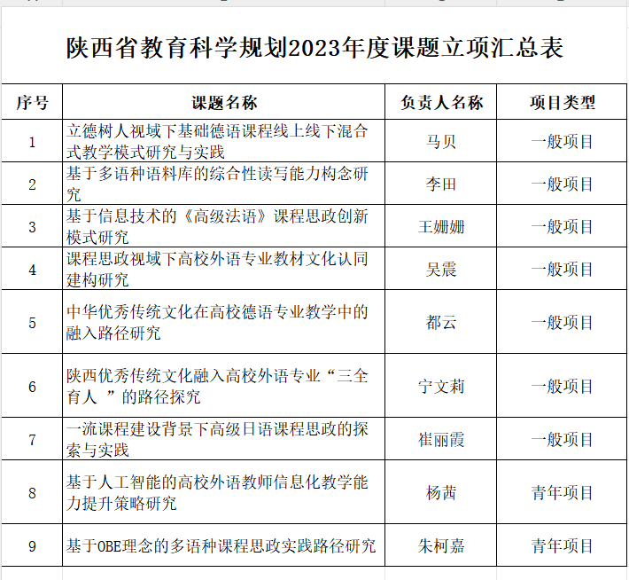 今日,陕西省教育科学规划领导小组办公室公布了“陕西省教育科学规划2023年度课题”立项名单,公司吴震、崔丽霞、李田、马贝、都云、王姗姗、宁文莉、朱柯嘉、杨茜9位老师获批立项。