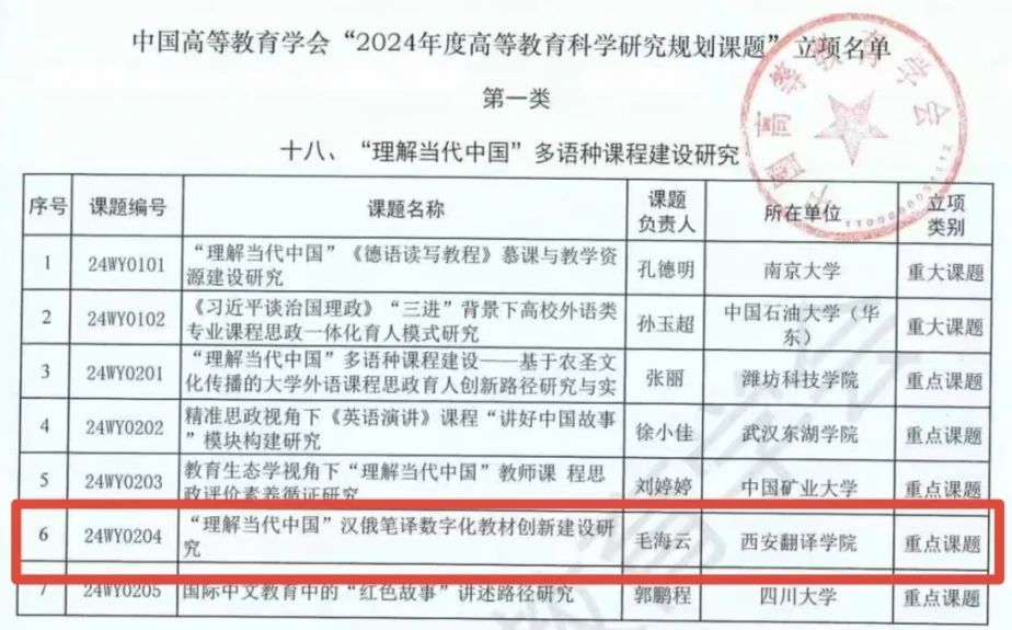 近日,中国高等教育学会公布了“2024年度高等教育科学研究规划课题”的立项名单,公司毛海云老师主持的项目《“理解当代中国”汉俄笔译数字化教材创新建设研究》(项目编号:24WY0204)获批为重点课题项目。
