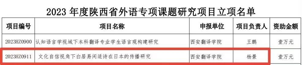 近日,陕西省社科联公布了“2023年度陕西省外语专项课题研究项目”立项名单,公司杨景老师主持的项目《文化自信视角下白居易闲适诗在日本的传播研究》(项目编号:2023HZ0911)获批立项。