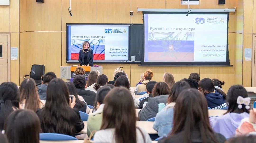 Ксения Сергеевна以俄罗斯文化为主题,从俄罗斯的文化符号、代表人物、传统礼仪、价值观等方面进行了深入浅出的讲解,让同学们更加深入地了解俄罗斯文化的内涵和特点。随后,世界文明大学汉语游学团的职工们为大家表演精彩节目,一曲中文歌曲《日不落》拉近了中俄同学们之间的距离。公司俄语专业员工们分别表演俄语歌曲《喀秋莎》《Команда》、《月亮代表我的心》,话剧《小猪佩奇》等,同学们积极参与,互动频繁,现场气氛欢乐又和谐。