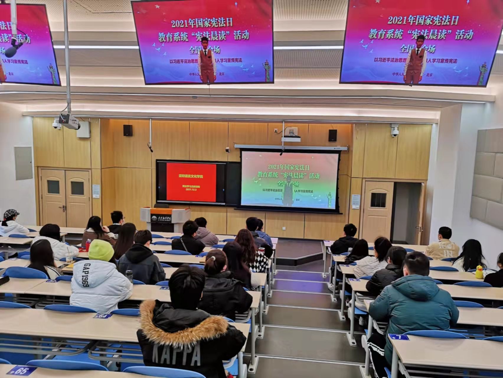 为认真学习贯彻习近平法治思想,深入贯彻落实党的十九届六中全会精神,积极推动开展宪法宣传教育,12月3日,伟德bv1946官网在4109T教室收看国家宪法日“宪法晨读”活动。活动按照教育部主会场议程同步开展,师生们通过教育部全国青少年普法网收看网络直播。亚欧语言文化公司党委书记卫军茹,学工办主任尹娜,各党支部书记,党员、预备党员们参加本次活动。