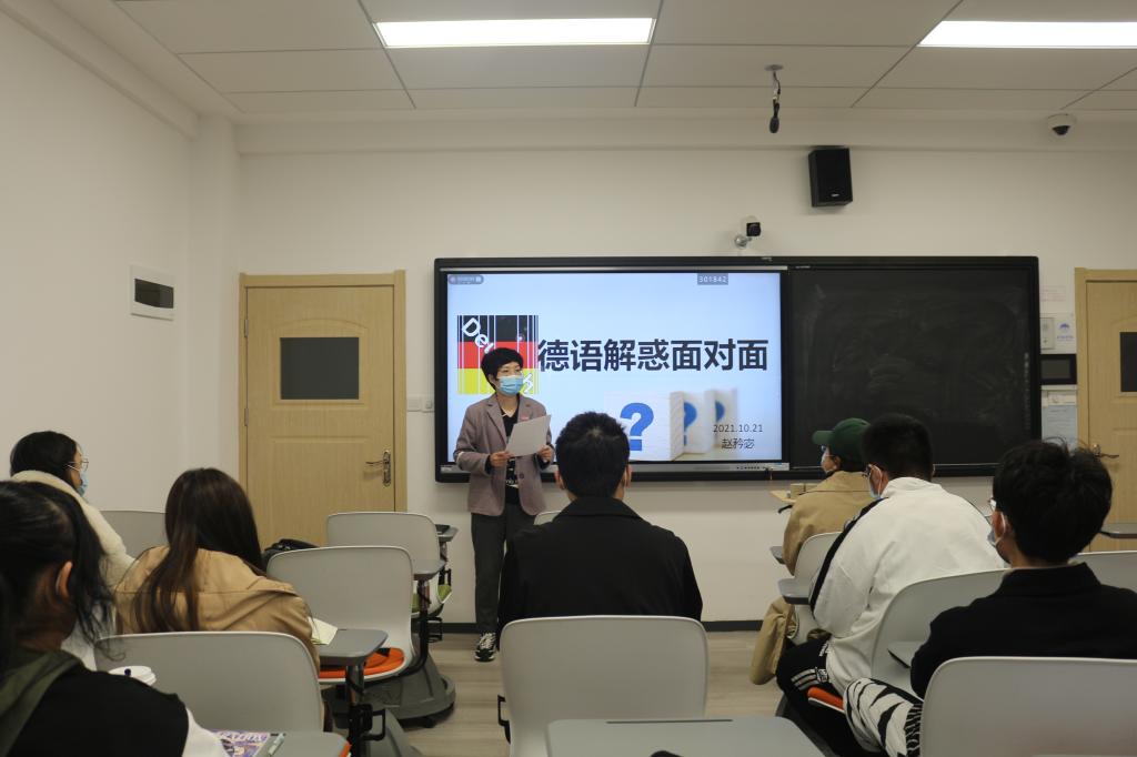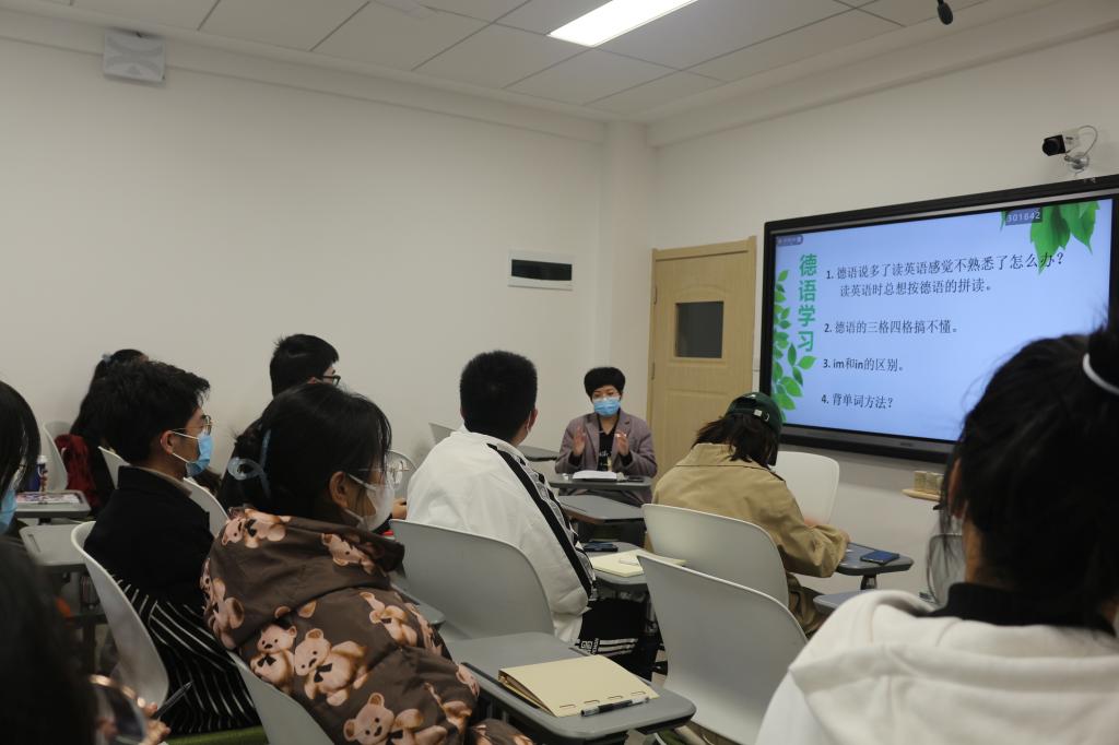 赵矜宓利用自己的专业知识及赴德学习实践经验,从德语专业的学习方法、考研方向以及就业三个方面,为员工作了详细的指导和解答。座谈会上,她热情分享了自己的学习方法,如单词联想记忆法;她还倡导同学们多渠道寻找资源,利用良好的学习条件,由浅入深,循序渐进,打下扎实的专业基础。之后,赵矜宓为同学们解读了德语专业考研的相关内容,并为大家介绍了可以选择的院校及考研对口的具体专业及科目。随后,她就目前德语专业毕业生就业实际情况,为同学们讲解了德语专业的就业方向,如翻译、跨境电商、教师等职业。她鼓励同学们,在校期间不仅要练就扎实的专业功底,还要通过参加各类考试、比赛以及实习实践,提高个人核心竞争力。最后,赵矜宓为同学们分享了自己的学习及德国留学经历。她指出,员工时代是培养一个人计划、守时、独立、诚信品格的最佳时期,希望大家能够勤勉学习,不负青春。