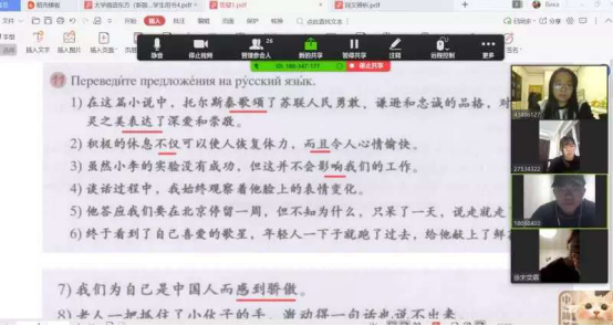 老师们克服重重困难,在摸索中不断前进。比如:法语系学术带头人史晓琴教授,本着对员工、对课堂负责的精神,开课前反复推敲、反复尝试各种平台的直播效果,并克服无教材、无资料等不利因素,为每课制作精美的PPT课件,圆满完成了线上授课的全部课前准备工作。教坛新秀李娅、杨景等教师积极发挥模范带头作用,为本专业教师树立榜样。日韩语系主任魏海燕积极耐心指导本专业教师及外聘兼职教师开展线上教学,在学习各类线上教学软件的同时,为本专业教师录制录屏软件使用说明。