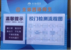 在各教学楼内,粘贴着注意事项的标语,各教学楼楼梯上贴有防滑条,校园内每日定时全方面消毒,保护“译”生,防护“疫”情。同时提醒各位员工返校后应多留意标语,提示牌。感谢老师们为我们的付出,为我们的返校做好充足的准备。