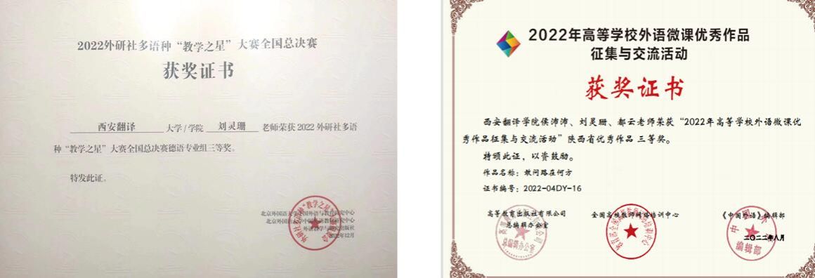 教学获奖不断:德语系教师在教学方面荣获2022外研社多语种“教学之星”大赛全国总决赛三等奖、第四届中国外语微课大赛陕西省三等奖,第三届全国高职高专德语口语技能大赛优秀指导教师奖,校级讲课比赛二等奖2次;指导员工参与老员工创新创业项目获2项省级银奖,4项校级铜奖。