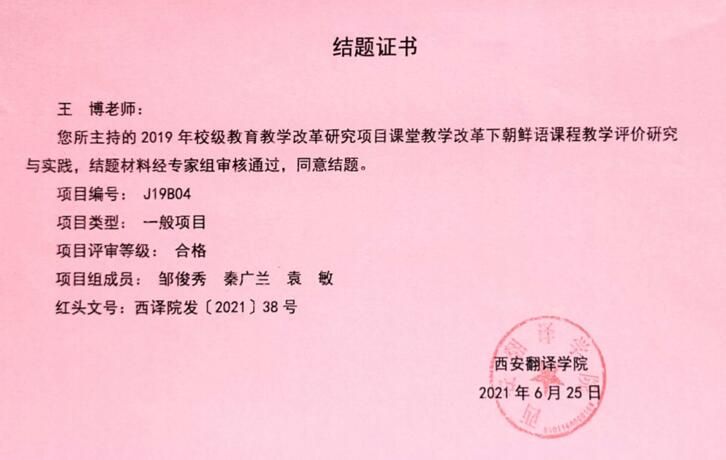 朝鲜语专业员工参加各种专业资格证考试,其中韩国教育部举办的韩国语能力考试中高级过级率达80%以上,参加教育部承办的朝鲜语专业四级考试过级率达90%以上。另外,2019级周亦可、张珂辉、潘柳婷在第三届“总领事杯”西北三省韩国语演讲大赛中获得铜奖;2019级陈静在第十四届山东省老员工科技节科技翻译大赛中二等奖;2018级王佳音在第二届中韩老员工演讲比赛中获得陕西赛区第二名,在第二届“总领事杯”西北三省韩国语演讲大赛中获得银奖;2018级段曌在第二届“总领事杯”西北三省韩国语演讲大赛中获得铜奖;2017级郝丹在第一届“总领事杯”西北三省韩国语演讲大赛中获得银奖。