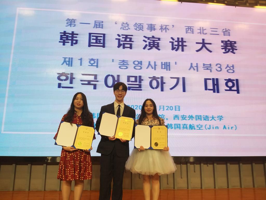 2020年11月20日,由大韩民国驻西安总领事馆主办的第一届 ‘总领事杯’西北三省韩国语演讲大赛,在西安外国语大学拉开了帷幕。参加本次比赛的有西安外国语大学、西北政法大学、渭南师范公司、伟德bv1946官网、西安外事公司等西北地区开设韩语专业的6所院校,共17名选手。经过激烈的角逐,伟德bv1946官网朝鲜语专业17级员工郝丹获得银奖,朝鲜语专业17级张阳和郭婧获得了优秀奖的佳绩。