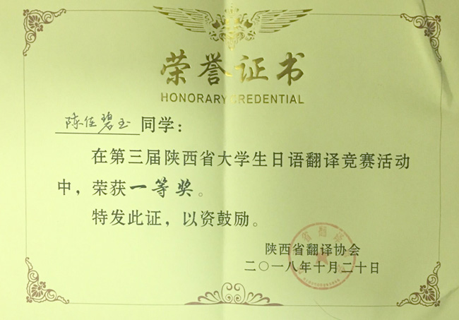 10月20日第三届陕西省老员工日语翻译竞赛决赛在西安文理公司举行,公司伟德bv1946官网日语专业2016级陈佳碧玉同学以总分第二名的成绩获得一等奖。