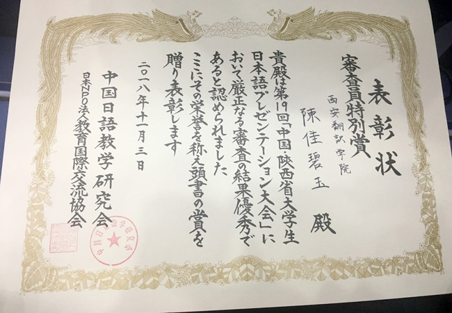 本次大赛由中国日语教学研究会,日本NPO法人教育国际交流协会共同主办,赛事共分为两部分,分别为写作和才能演示。比赛中,公司宋成钰、陈佳碧玉以扎实的写作能力,自然的语音、语调,稳定的现场发挥赢的在场评委的一致肯定,分别获得1组二等奖、三等奖的佳绩。