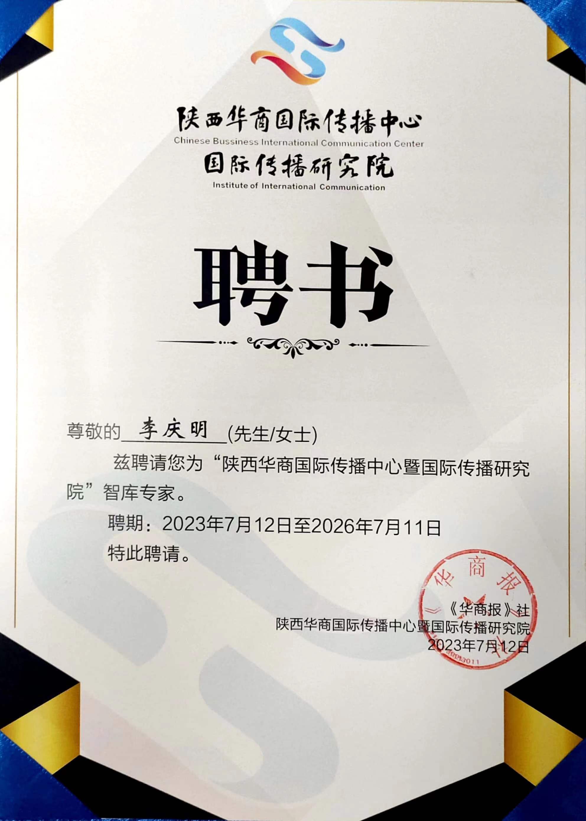 7月12日,陕西华商国际传播中心暨国际传播研究院揭牌仪式在陕西西安《华商报》社隆重举行。陕西省侨联党组书记程勉贵、中共陕西省委宣传部巡视员可小闹、华商传媒集团总裁王朝阳以及业界和学界专家学者齐聚一堂,共同见证中心和研究院的成立。会上宣读了国际传播研究院首批首席专家名单并颁发证书。伟德bv1946官网经理李庆明教授受聘首席专家。