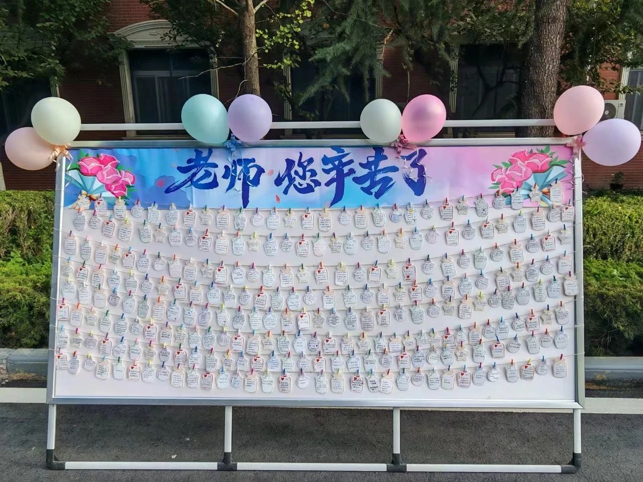 在这个充满温情与敬意的九月,公司1200多名员工,怀着感恩的心,利用自己专业的语言,在精美的小卡片上写下自己内心最诚挚的祝福,每一张贺卡都承载着员工对教师最真挚的情感。随后,公司收集所有卡片并悬挂在宣传板上,在三号楼门前进行展示。