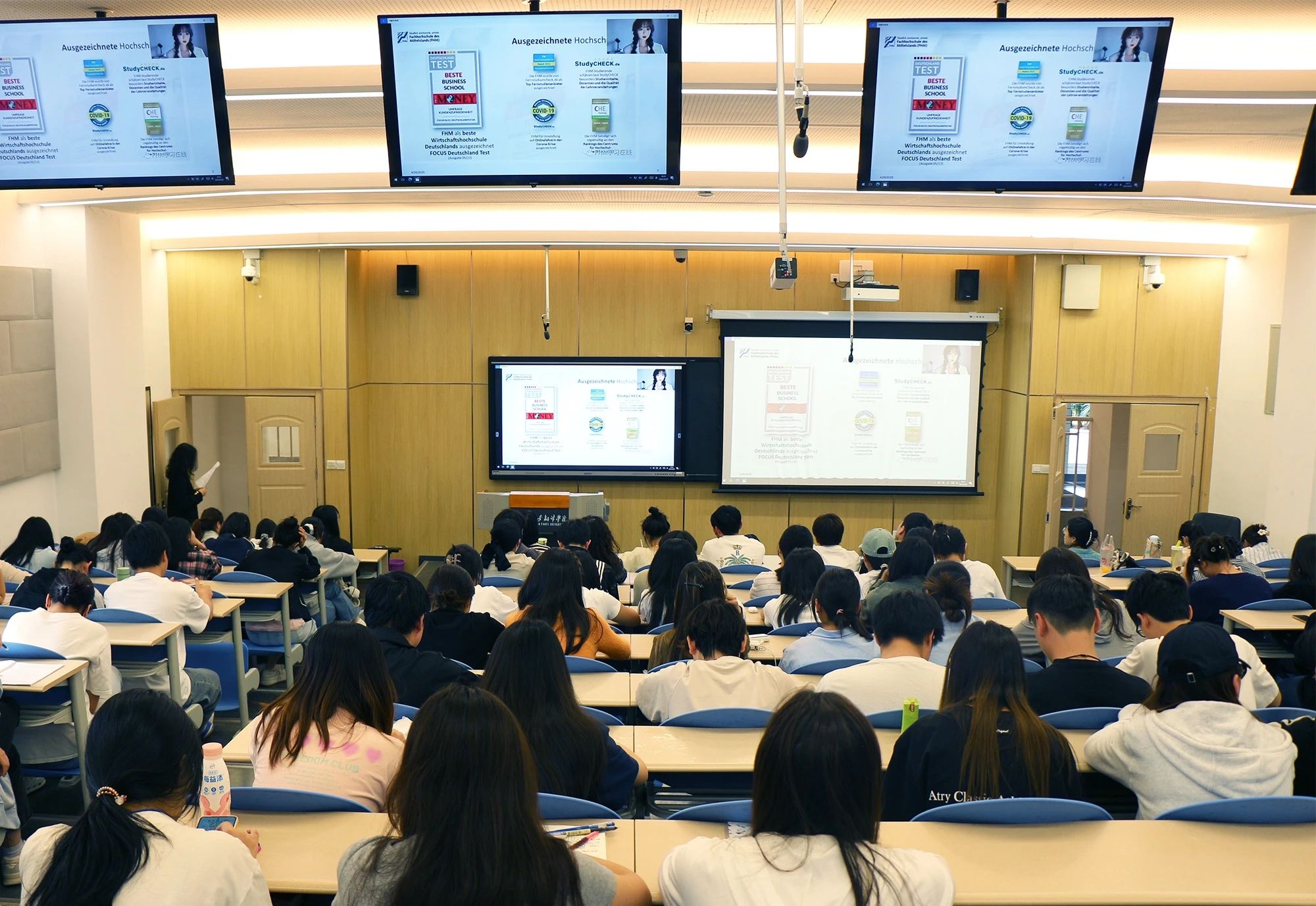 会议采用线上线下相结合的形式,特邀四位2025届优秀毕业生代表进行经验分享。德语专业杨皓月通过视频的方式,详细介绍了公司和德国比勒菲尔德应用技术大学本硕连读"3+1+1"项目的特色优势。她结合在德国的学习经历,强调语言能力是国际项目的关键基础,建议学弟学妹夯实专业基础,提前做好语言准备。