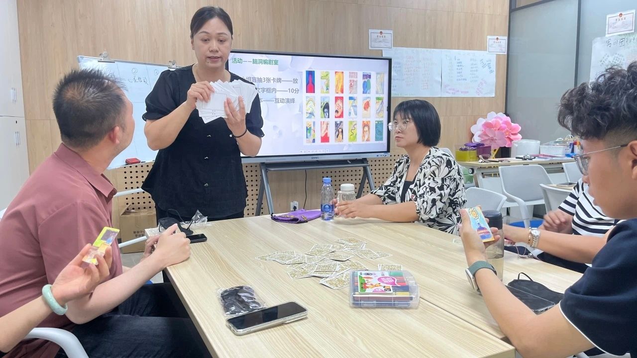 随后,沙龙进入核心环节。张芳老师首先系统介绍了OH卡牌这一心理探索工具的精神内核、适用的心理学理论基础及游戏规则。在张老师的专业引导下,全体辅导员以小组为单位,沉浸式体验了一系列精心设计的OH卡牌探索活动。“脑洞编剧室”活动,激发了大家的创造力,练习如何引导员工进行生涯愿景畅想与叙事构建;“觉察我的感受”活动,通过深化自我情绪体察,提升在辅导中识别与共情员工情绪状态的能力;“自我对话”活动,引导辅导员探索内在声音,为帮助员工进行自我认知与内在对话提供示范;“重新认识自己与团队”活动,在互动中深化自我认知,理解团队动力,如何促进员工个体在群体中的融合与成长;“寻找我的能量”活动,聚焦发掘个人内在资源与优势,探索如何助力员工识别并运用自身能量应对挑战;“压力变形雕塑馆”活动,通过非语言表达释放压力,可视化心理转化过程。