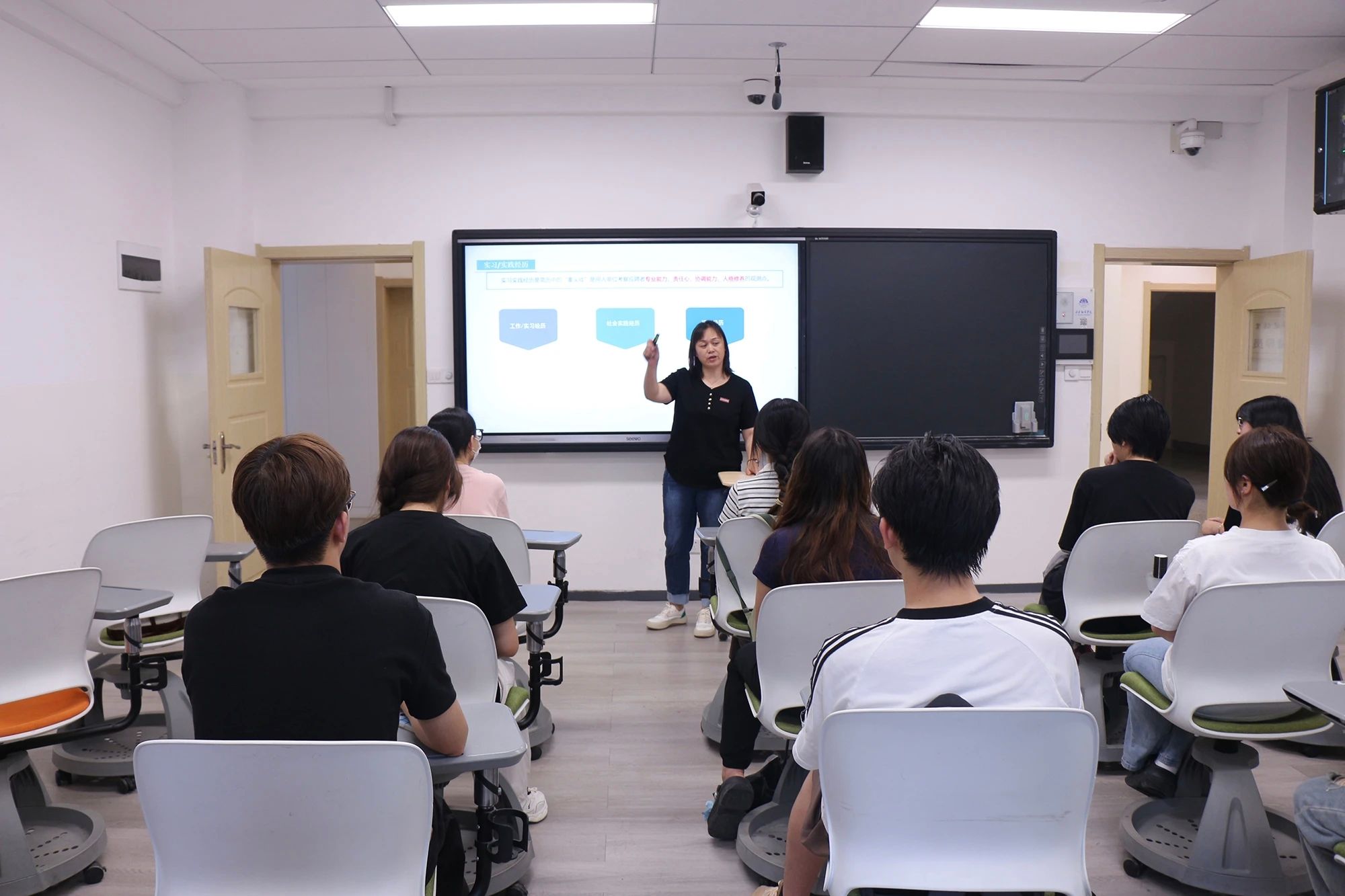 随后,张芳深入浅出地剖析了优秀简历的核心价值。她特别指出,在人工智能技术快速发展的当下,善用AI工具能有效提升简历竞争力。讲座重点分享了AI辅助简历优化的实用方法:利用AI精准分析目标岗位关键词,实现简历内容的高度匹配;将实习、实践经历转化为具体、量化的成果(例如“跟进订单X笔,准时率100%”),增强说服力;并学习高效对话AI的技巧,用于生成初稿或优化语言表达。她同时提醒,AI是辅助工具,最终仍需结合个人特点和目标岗位进行深度打磨。