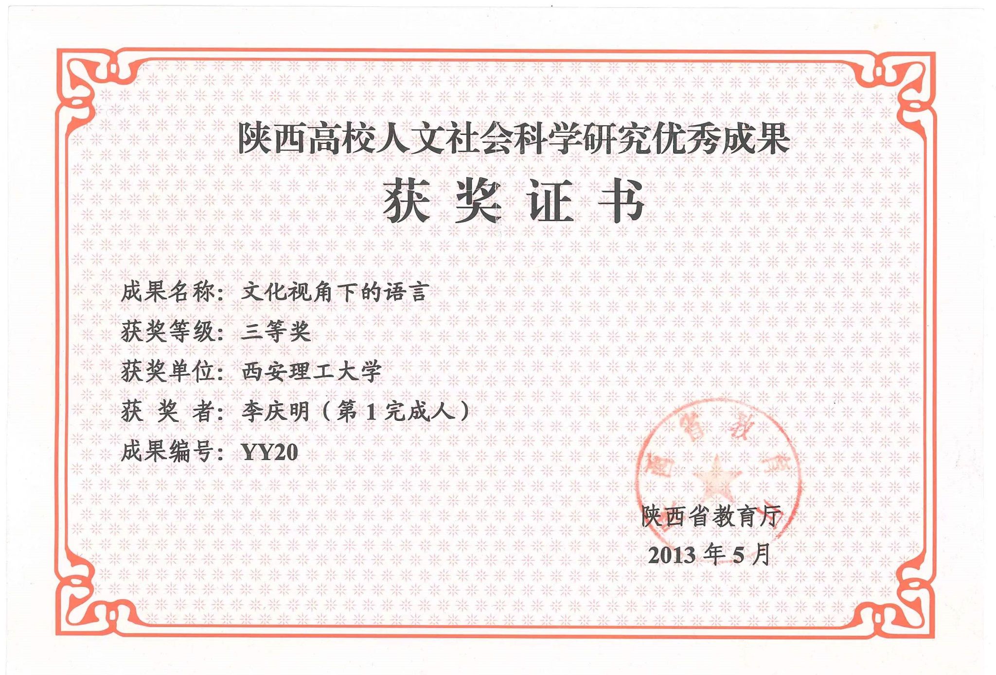6.《文化视角下的语言》,陕西高等公司人文社会科学研究优秀成果三等奖(著作),2013;