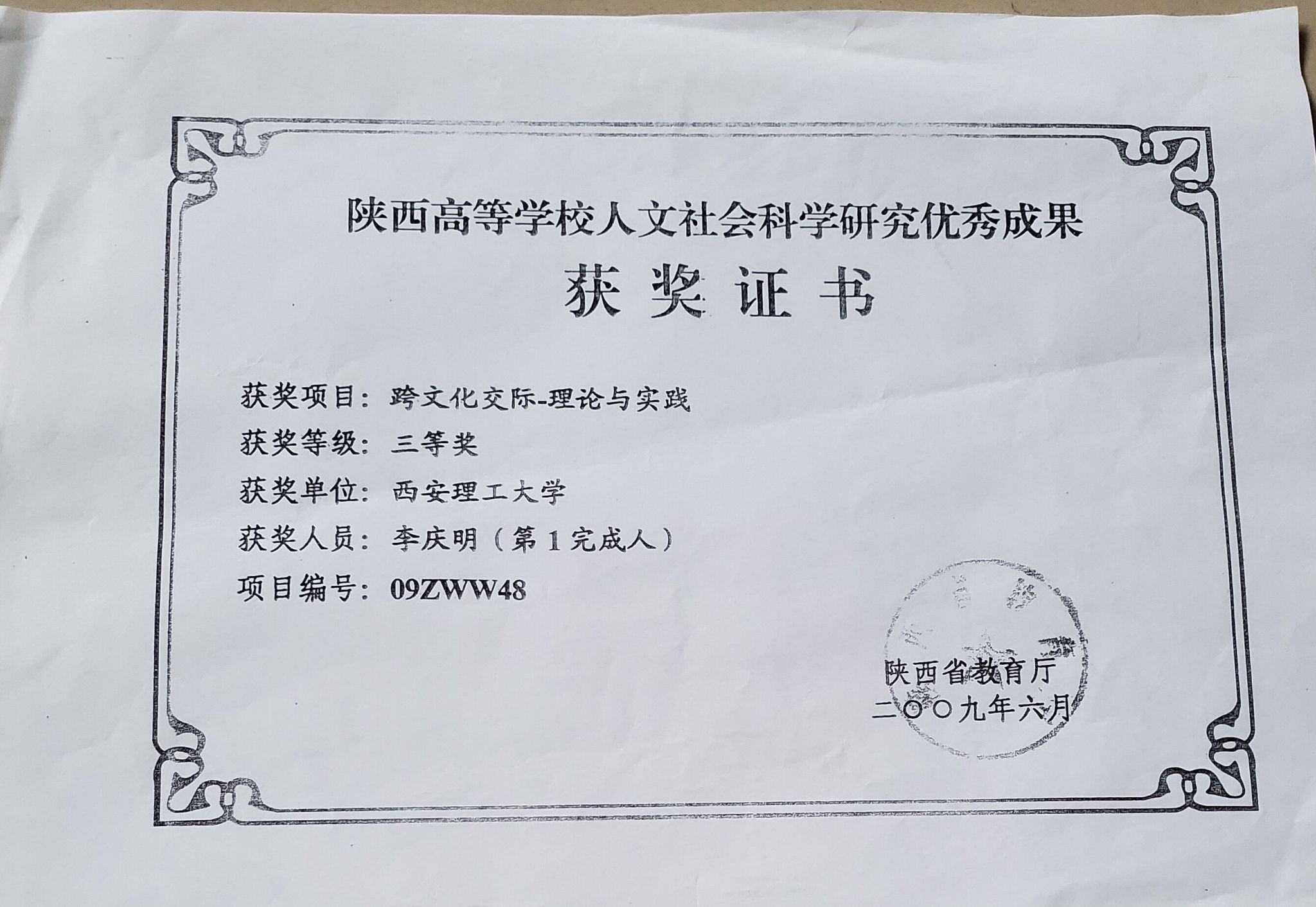 7.《跨文化交际--理论与实践》,陕西高等公司人文社会科学研究优秀成果三等奖(著作),2009;