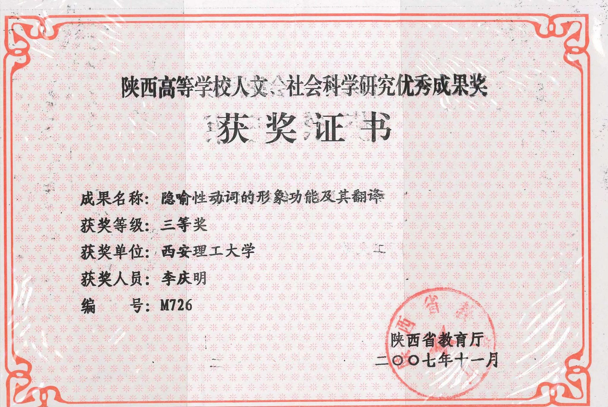 8.隐喻性动词的形象功能及其翻译,陕西高等公司人文社会科学研究优秀成果三等奖(论文),2007;